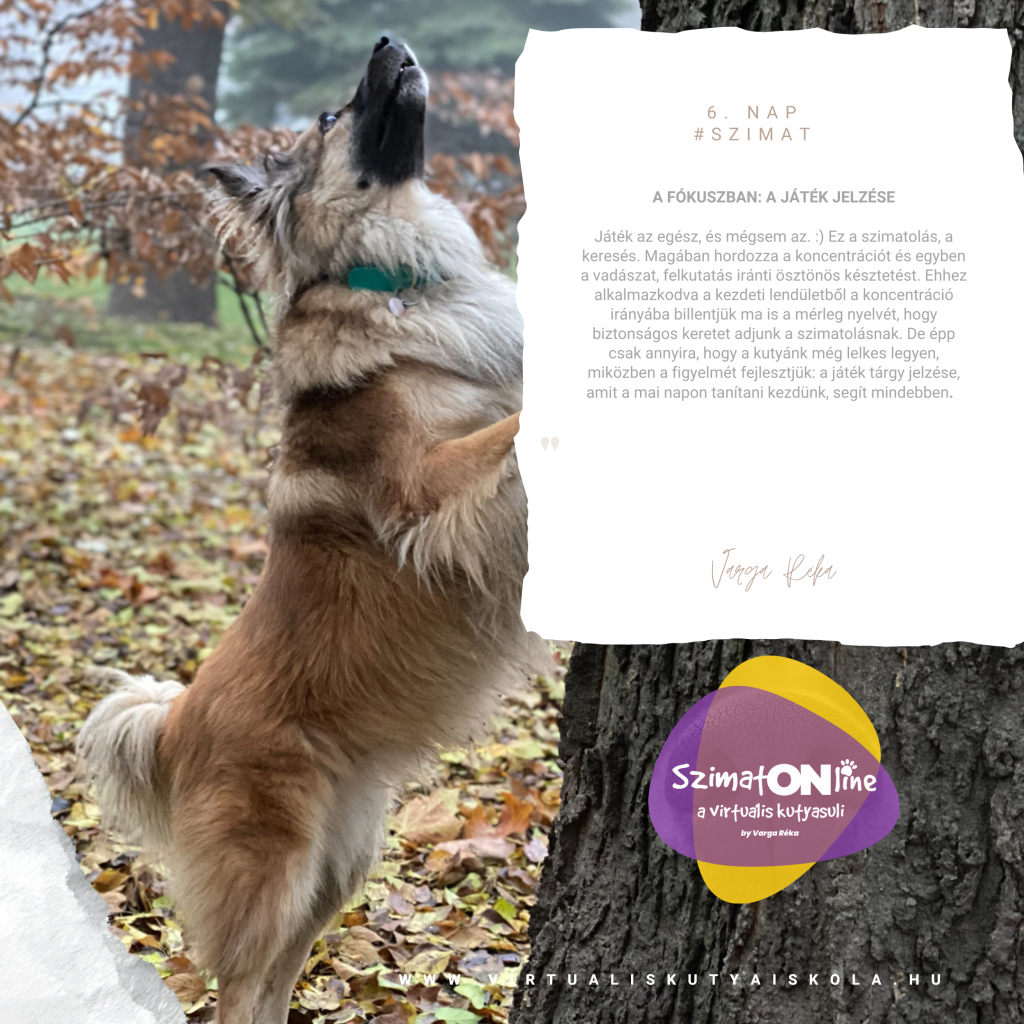 Játék az egész, és mégsem az. 🙂 Ez a szimatolás, a keresés. Magában hordozza a koncentrációt és egyben a vadászat, felkutatás iránti ösztönös késztetést. Ehhez alkalmazkodva a kezdeti lendületből a koncentráció irányába billentjük ma is a mérleg nyelvét, hogy biztonságos keretet adjunk a szimatolásnak. De épp csak annyira, hogy a kutyánk még lelkes legyen, miközben a figyelmét fejlesztjük: a játék tárgy jelzése, amit a mai napon tanítani kezdünk, segít mindebben.